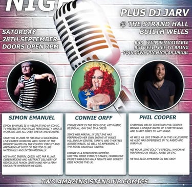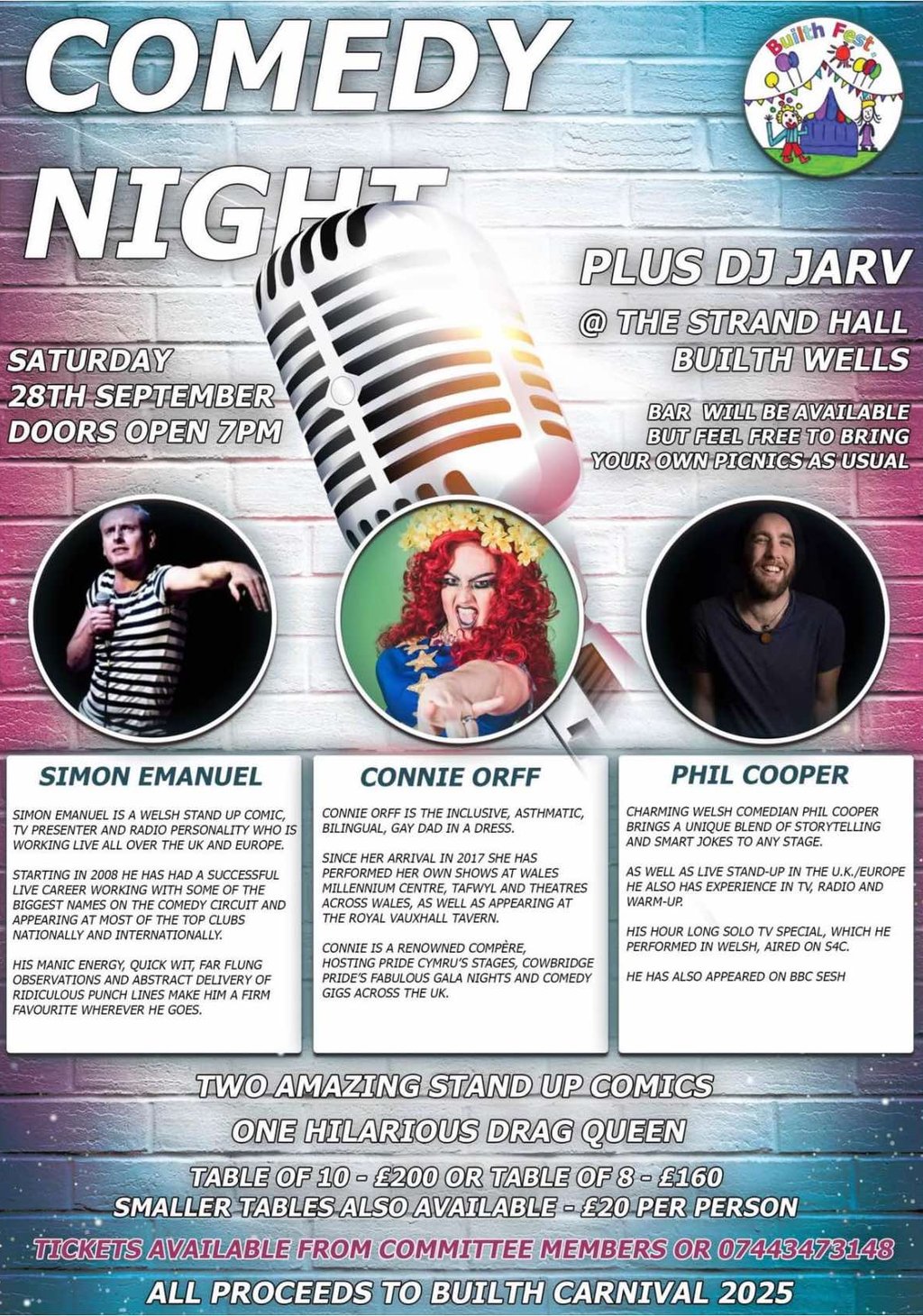 Looking for a night of laughter and fun? Join us for Builth Fest’s Comedy Night on Saturday, 28th September at The Strand Hall, Builth Wells! With a stellar lineup of comedians, plus music from DJ Jarv, this is going to be an unforgettable evening of entertainment.
