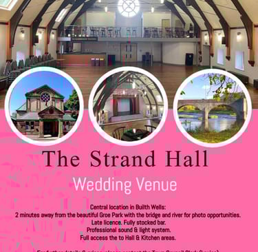 Planning your special day? Look no further than The Strand Hall, a beautiful and versatile wedding venue located in the heart of Builth Wells.