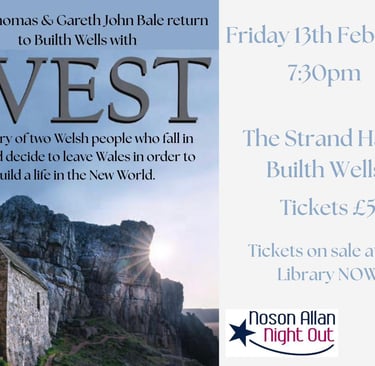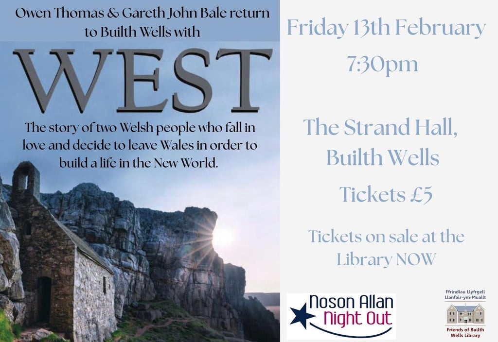 Builth Wells is set to welcome performers Owen Thomas and Gareth John Bale back to town with their production WEST, an engaging and moving story of two Welsh people who fall in love and make the life-changing decision to leave Wales to seek a future in the New World.